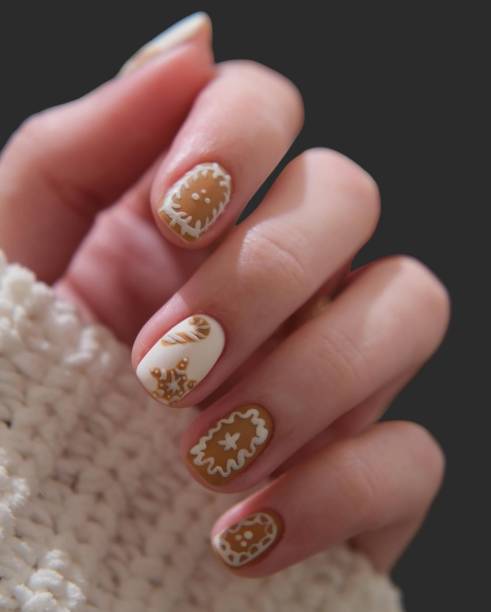 Turn your nail tips into mini gingerbread house roofs with icing-like designs.